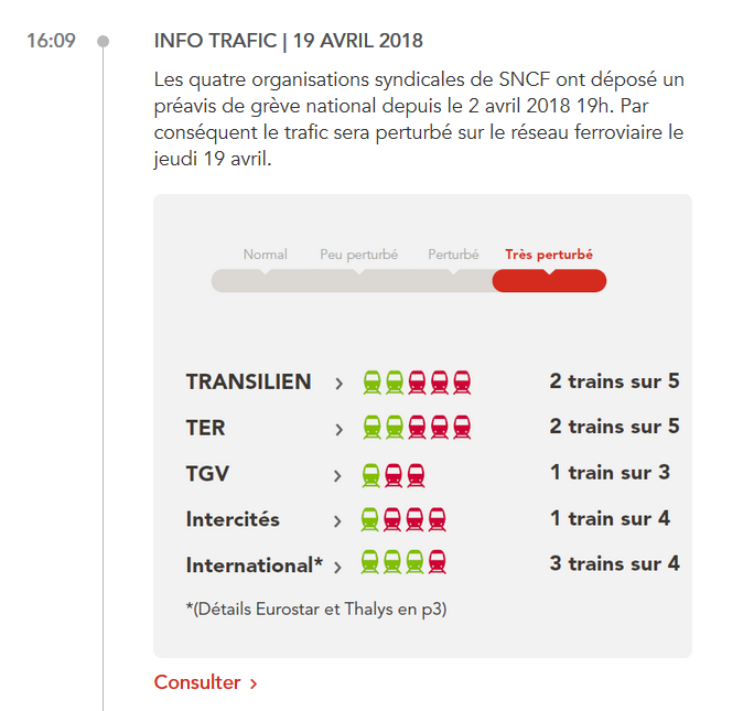 Nous saurons la veille seulement si notre train est en circulation ou non. Jusqu’à maintenant, durant les jours de grève, un train sur trois l’est, les autres sont retirés. Pour cette raison, j’ai choisi de préparer un plan B en réservant une voiture de location au Hertz de Roissy (aéroport CDG). Si nous voyons la veille du départ que notre train circule, je pourrai alors annuler la réservation.